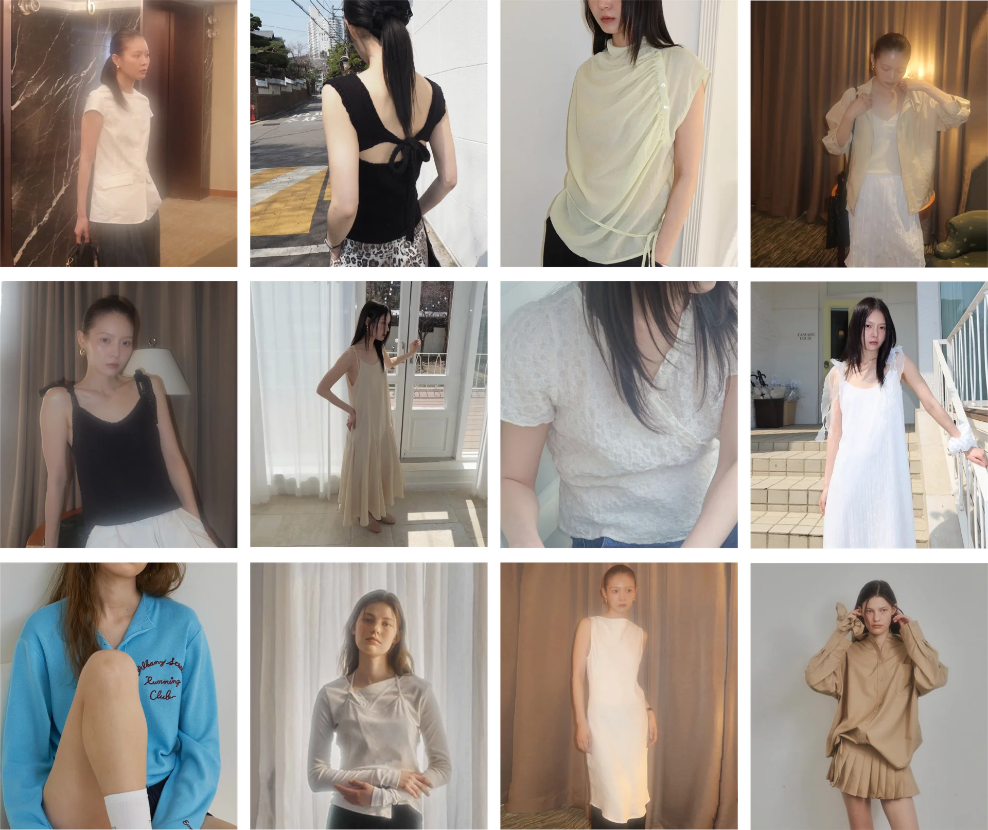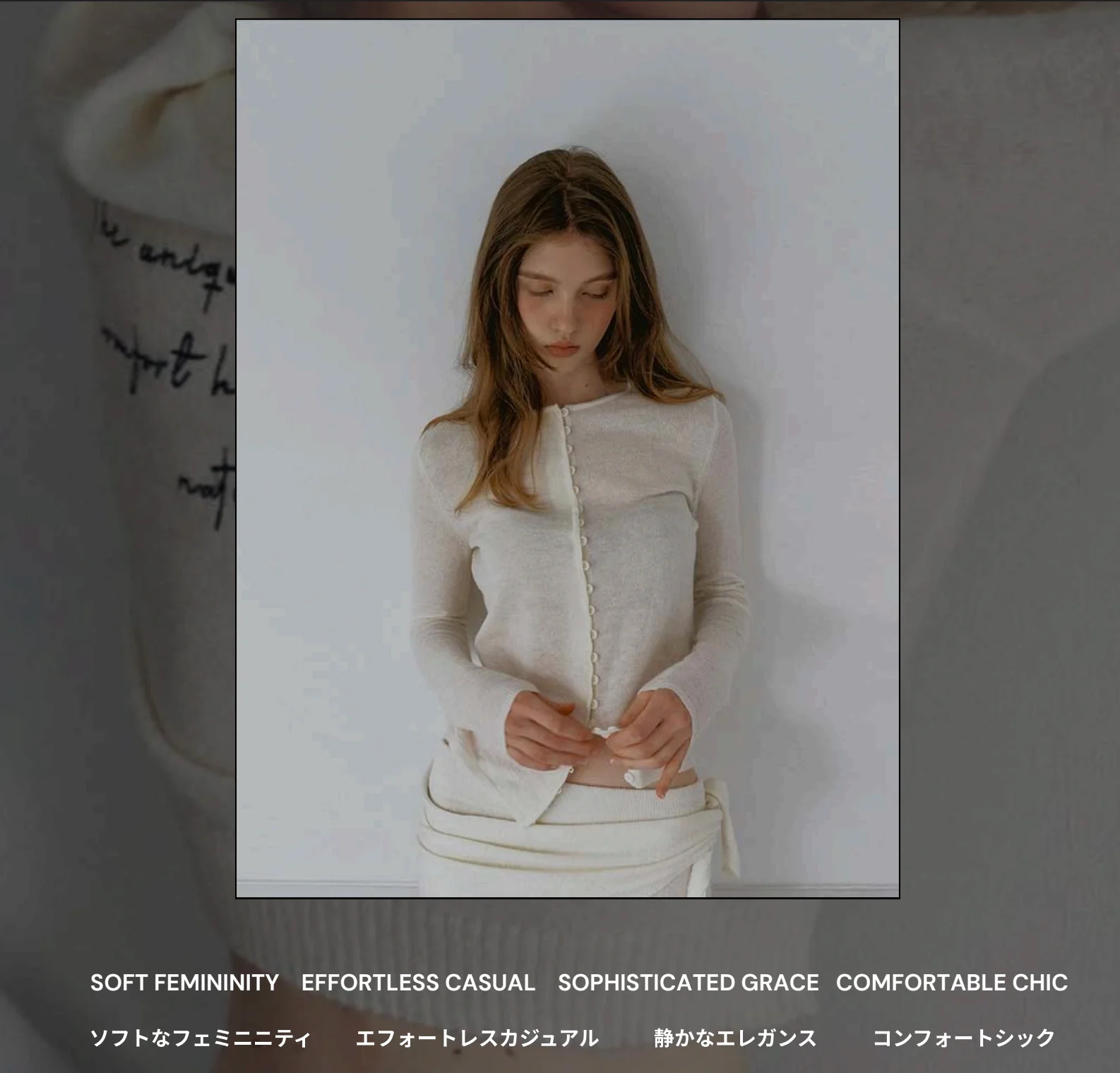 레이스 슬립 탑, 비치는 니트, 나른하게 떨어지는 드레스, 살짝 비틀린 실루엣의 셔츠 — 모든 아이템은 의도적인 흐릿함과 동시에 절제된 감각을 갖추고 있으며, 부드럽고 뉴트럴한 중성적인 색감이 브랜드의 무드를 완성합니다.