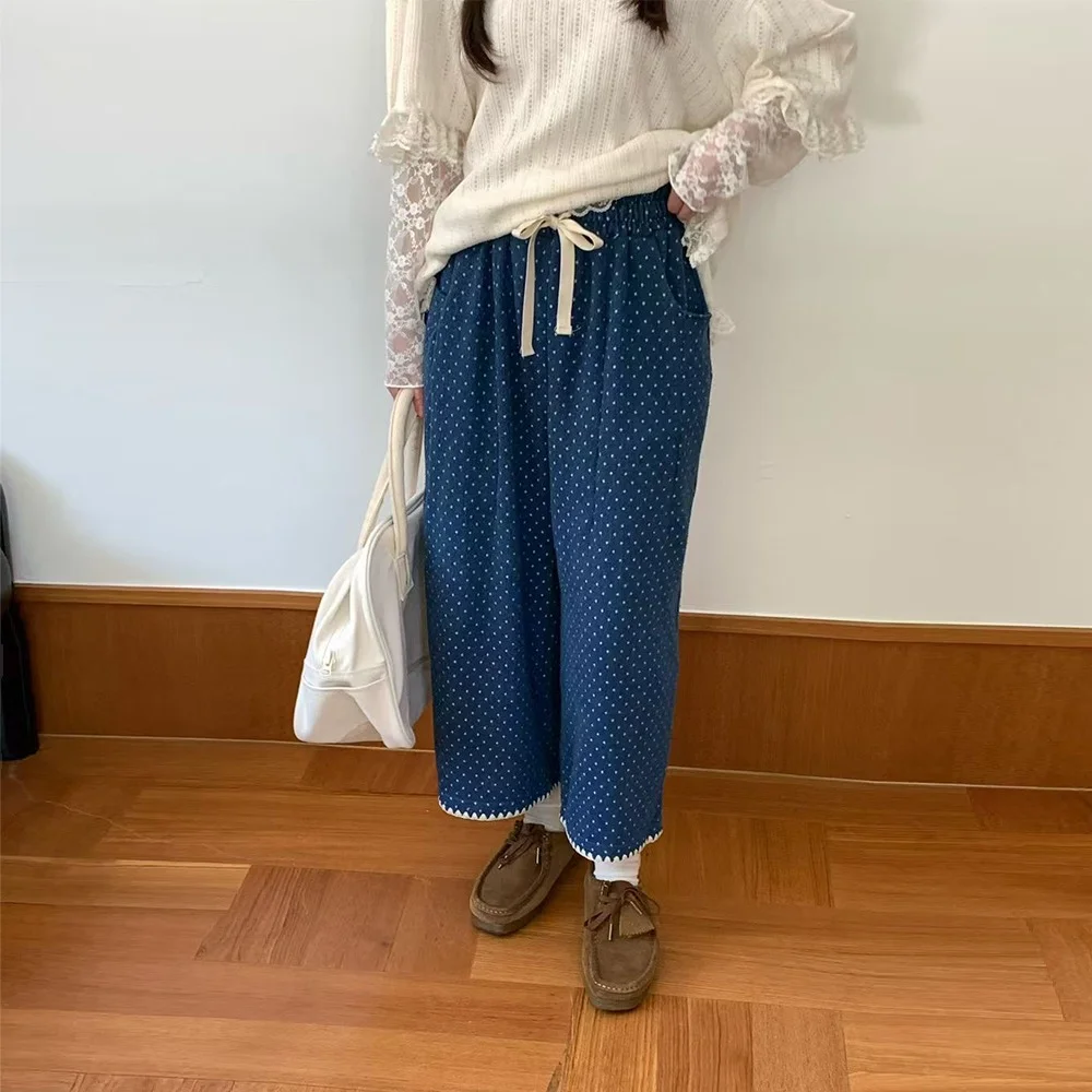 A perfect mix of comfort and style. With an elastic waistband, a fun dot print, and lace detail at the hem, these pants are practical yet playful.